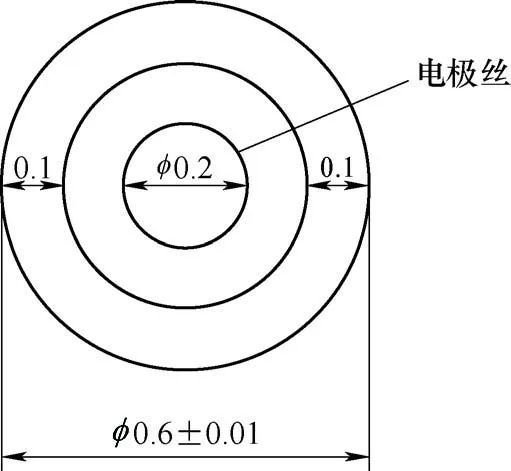 2)高(gāo)精度內孔與外圓的同軸度要求高。陽極兩端雙內錐孔和中間微小(xiǎo)孔需要與(yǔ)外圓保證同軸度φ0.01mm以內,結構之間(jiān)才能較好過渡,從而避免(miǎn)出(chū)現結構錯位(wèi)。為保證後續線切割(gē)能加工內孔(kǒng)成(chéng)形,穿絲孔需要單邊留餘量≥0.1mm,φ0.2mm電極絲與放電間隙之和需要≥0.25mm,避免慢走絲(sī)加工時,因電極(jí)絲裝(zhuāng)夾偏離穿絲孔中心(xīn)較大而造成短路。φ(0.6±0.01)mm內孔的穿絲孔孔(kǒng)徑最大可達φ0.4mm。線切割絲徑與內孔如圖(tú)2所示(shì)。穿絲(sī)孔為深徑比達57的深小孔,並要求與外圓的同軸度<φ0.10mm,可避免φ(0.6±0.01)mm內孔加工後留下穿絲孔痕跡。