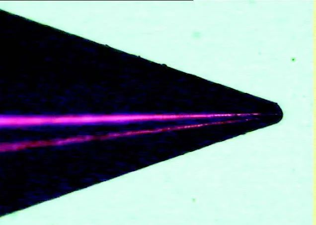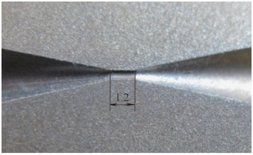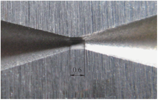 針對慢走絲線切割錐麵時φ (0.6±0.01)mm內孔幹涉問題,采取加(jiā)工時φ 0.6mm兩端孔(kǒng)口到端麵距離分別留餘量0.2mm的措施。此時錐角需加(jiā)工至24°。然後其餘錐孔尺寸和內孔長度轉至電火(huǒ)花成形(xíng)加工。線切(qiē)割後中心微小孔形貌如(rú)圖5所(suǒ)示。