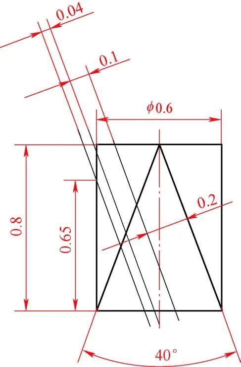 3)線切割雙內錐孔與微小孔時易產生相互(hù)幹涉。線(xiàn)切割加工40°±20′錐孔後,φ(0.6±0.01)mm微小孔長度(0.8±0.03)mm易產(chǎn)生過切(見圖3),長(zhǎng)度超差。加工40°錐(zhuī)角時,主切偏移量為0.1mm,再加上0.04mm放電間隙,當電極絲傾斜20°時,影響φ0.6mm微小(xiǎo)孔(kǒng)60°方向孔口到(dào)60°端麵距離。