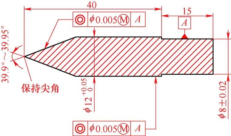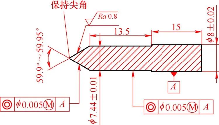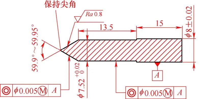 陽極材料為(wéi)WRe25鎢錸合金,外圓和端(duān)麵對幾何公差要求較高(gāo),內部結構加工要求也較嚴格,內(nèi)錐孔錐角40°±20′和60°± 10′、φ(0.6±0.01)mm微小(xiǎo)孔與外圓同軸度(dù)φ0.01mm以內,φ(0.6±0.01)mm微小孔長度(0.8±0.03)mm,錐孔角度公差最嚴要求為±10′,表麵質量達到表麵粗糙度值Ra<0.8μm。陽極如圖1所示。