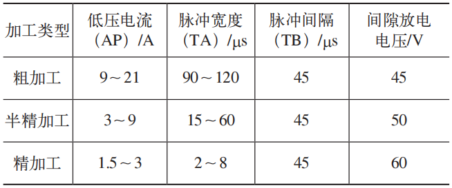 加工過程(chéng)中粗(cū)加工需要大能量去除餘量,然後精加工深度達到尺寸(cùn)公差要求,修光表麵達到工藝要求。加工過(guò)程(chéng)中的參數,隨著零件表麵餘量的減少,低壓電流和脈寬逐漸減小(xiǎo),間隙放電電壓逐漸變大。電加工參數見表1。