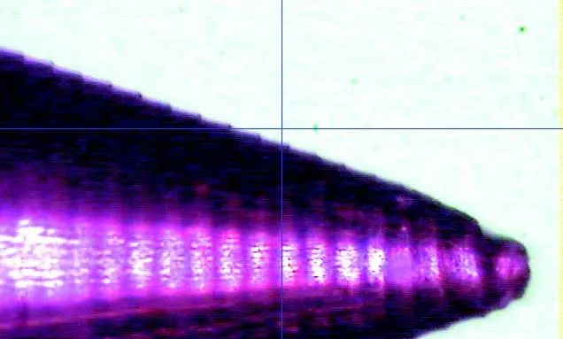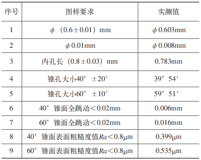加工後的陽極經過微小孔、雙錐(zhuī)孔及表麵質量檢測(cè),全部滿足(zú)圖(tú)樣要求(qiú),微小孔實測值為φ0.603mm,與外圓同軸度為φ0.008mm,錐麵全跳動最(zuì)優可達(dá)0.006mm。陽極檢測值見表(biǎo)2,陽極外觀如圖10所示。