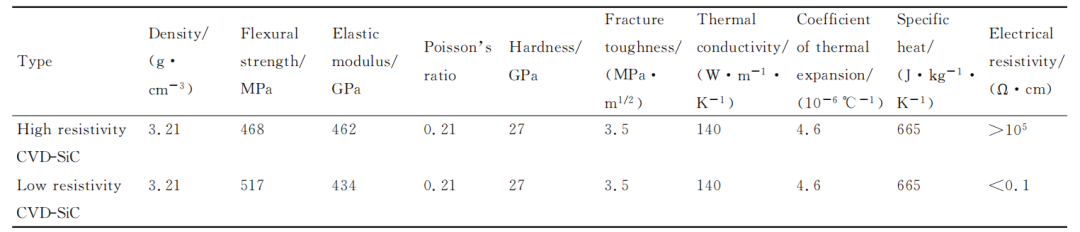 導電(diàn)SiC陶瓷的製備方(fāng)法有(yǒu)化學氣相沉積(CVD)和粉末燒結(jié)。商業化應用的CVD技術已能製(zhì)備出高純度(99.999%)、低電阻率(<0.1Ω·cm)的氮摻雜導電SiC陶瓷。由下表(biǎo)可知,低電阻率的導電CVD-SiC陶瓷的其他性能與傳統的高電阻率CVD-SiC相當。