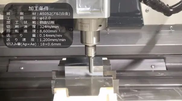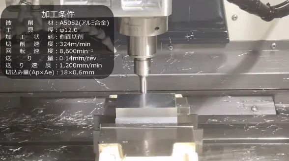 A5052鋁合(hé)金工件進行側麵切削加工,使用直徑12mm銑刀,加裝在新產品NAKANISHI高速電主軸BMS-5010進行(háng)加工(gōng),下麵鬆本機(jī)電(diàn)就來簡(jiǎn)單展示加工時參數。