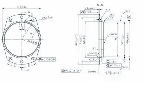 圖1為法蘭盤軸承整體結構(gòu)。法蘭盤是法蘭盤軸承實現小遊隙和自調心功能的重要(yào)零部件,其自身的尺寸精度和幾何公差(chà)對整個軸承的(de)使用功能起著決定性作用。法蘭盤(pán)內球麵的加工精度和安裝孔位的定位精度,直接決定了軸承的使用壽命和性(xìng)能(néng),同(tóng)時影響裝配後與整(zhěng)個軸承的(de)調心能力(lì)的強弱和偏轉力矩(jǔ)的大小。而(ér)調心(xīn)能力、偏轉力(lì)矩和遊隙大小直接影響(xiǎng)組件功能(néng)的實現。為了滿足法蘭盤(pán)軸承的整體(tǐ)功能需求,提(tí)高自身精度等級,設計人員對法蘭盤的機械加工提出了(le)更加嚴苛的要求。