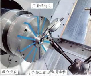 若在(zài)零件粗加工階段,使用退火處理後的棒(bàng)料,將外徑和端麵光整後裝夾(jiá)外徑(jìng),一次裝夾進行內徑打孔和擴孔,再進行小外徑的切削,通過熱(rè)處理應(yīng)力釋放後(hòu),再進行後續零件半精(jīng)加(jiā)工(gōng)和精加工,可以保證應力釋放條件下零件的(de)加工(gōng)精(jīng)度;若采用磁力吸盤和定位銷釘配合裝夾的方式,能夠實現軸向(xiàng)壓緊的無徑向力裝夾方式,可以大大減小加工過程(chéng)中由(yóu)於裝夾力產生(shēng)的法蘭盤徑向形(xíng)變,提高機械加(jiā)工的尺寸精度和幾何精度,保證零件加工的最終效果。