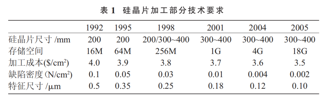 另外,在現代國防和軍事(shì)方麵,電子(zǐ)信息化武(wǔ)裝的武器裝備在(zài)現(xiàn)代戰爭中發揮著(zhe)越來越重要的作用,甚至起(qǐ)著決定戰爭勝負的關鍵性(xìng)作用。所有這一切的發展和需要,都是建(jiàn)立在半導體矽材料的基礎之上。半(bàn)導(dǎo)體矽材料是(shì)半導體工業最重(chóng)要的主體功能材料,是第一大功能電子材料,至今(jīn)全球矽材料的使(shǐ)用仍占半導體材(cái)料總量的95%以上。矽材料、矽器件和矽集成電路的發展與應用水平早已成為一個國家的國力、國防、國(guó)民經濟現代化及人(rén)民生活水平的重要(yào)標誌(zhì)。集成電路自 1959 年(nián)發明以來,集成電(diàn)路芯片 的集成度在不斷提高,而加工特征尺寸(cùn)和加工成(chéng) 本逐步縮小[2],如表 1 所示。