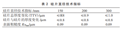 1.3.2 超精密磨削研究現狀 (1)矽片自旋(xuán)轉磨削。采用略大於矽片的(de)工(gōng)件轉台(tái),通過真空吸盤每次裝夾一個矽片,矽片的中(zhōng)心與轉台的(de)中心重合,杯形金剛石砂輪的工(gōng)作麵調整到矽片的中心位置。磨削時,矽片和砂輪繞各自的軸線回轉,砂輪隻進行(háng)軸向進給。在超精密磨削中,金剛石砂輪的修整情況對零件的加工質量有決定(dìng)性影響。其修整過程主要包括修(xiū)平 / 結(jié)合(hé)劑去除和去尖,修平一般采用金剛石砂輪磨削相對軟質物質(zhì)。結合劑(jì)去除主要采 用電解法和接觸放電法。目前,采用矽片自旋轉磨(mó)削方法(fǎ)加工直(zhí)徑 150~ 400 mm(6~16 英寸)矽片,可實現(xiàn)矽(guī)片的正麵超精密磨削和背麵磨削減(jiǎn)薄,所(suǒ)達到的技術指標見表 2。