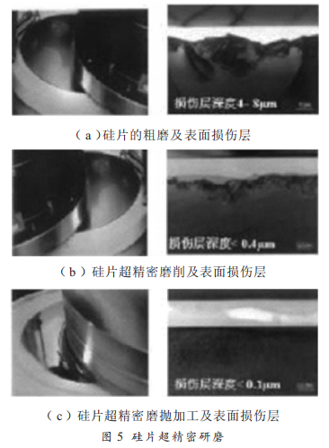 圖 5(a)、圖 5(b)、圖(tú) 5(c)為矽片的粗磨、超精密磨削和超精密磨拋加(jiā)工(gōng)及其表麵損傷(shāng)層。